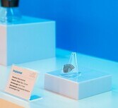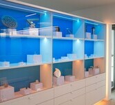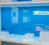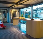 Neu umfasst der Eingangsbereich eine grosszügige Empfangstheke, einen Bereich für kurze Besprechungen sowie eine Präsentationsvitrine mit ausgewählten Bauteilen. Die Gestaltung orientiert sich am neuen Markenauftritt und greift dessen zentrale Elemente auf.