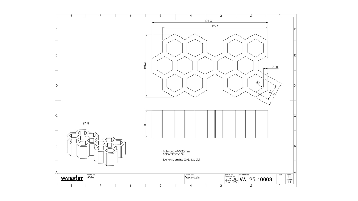Wabenförmige Konturgeometrie mit definierten Stegbreiten – Toleranzvorgabe ± 0.25 mm.