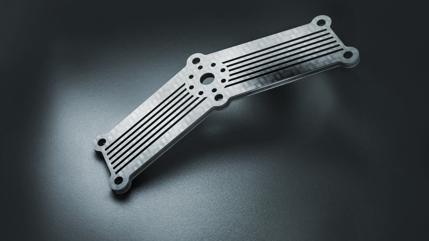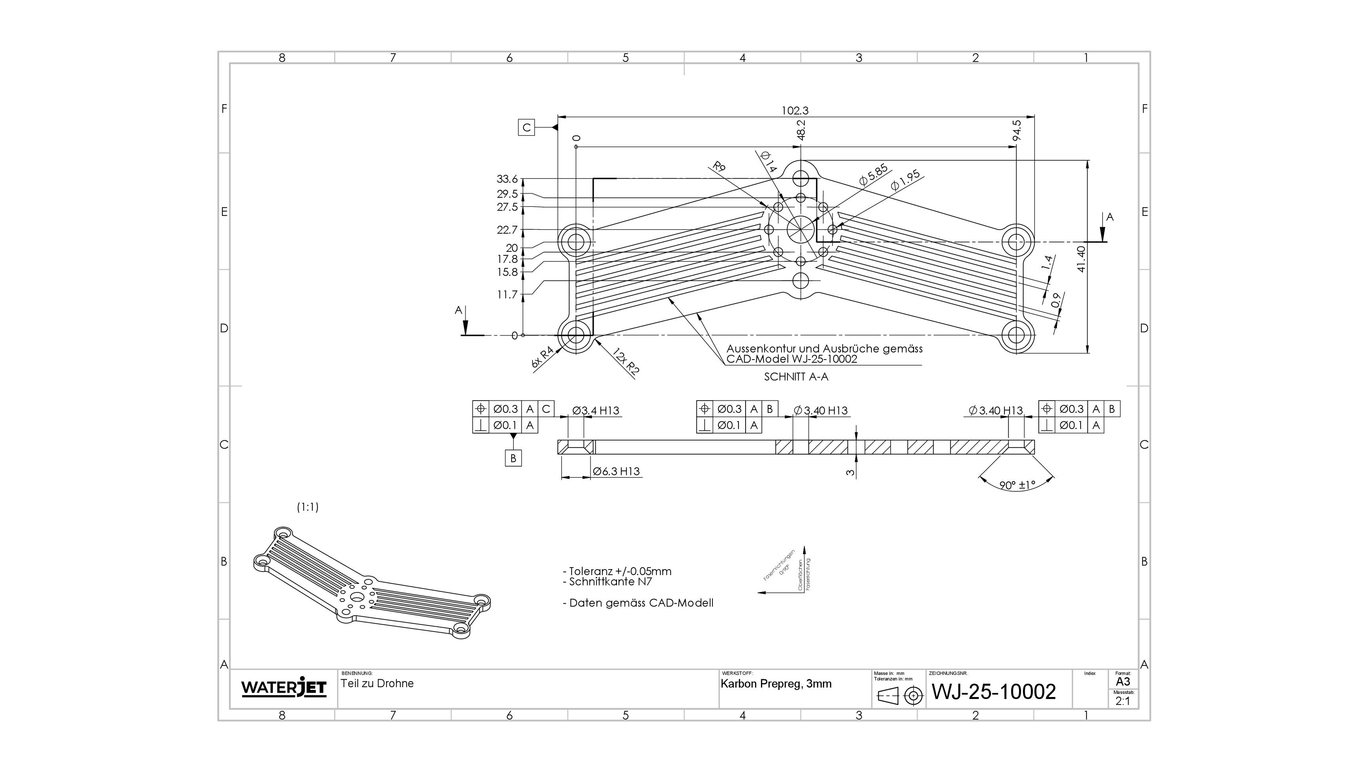 Kontur mit feinen Durchbrüchen und enger Toleranzvorgabe ± 0.05 mm – hohe Stabilitätsanforderung im Leichtbau.